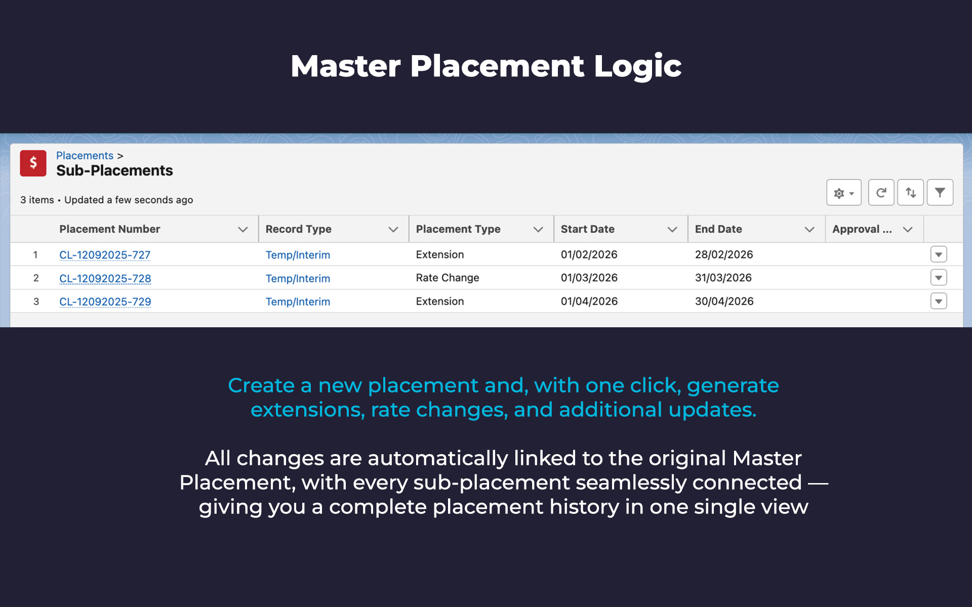 Extendify maintains structured relationships between master placements and related actions, ensuring accurate deal values, clean reporting, and full audit visibility.